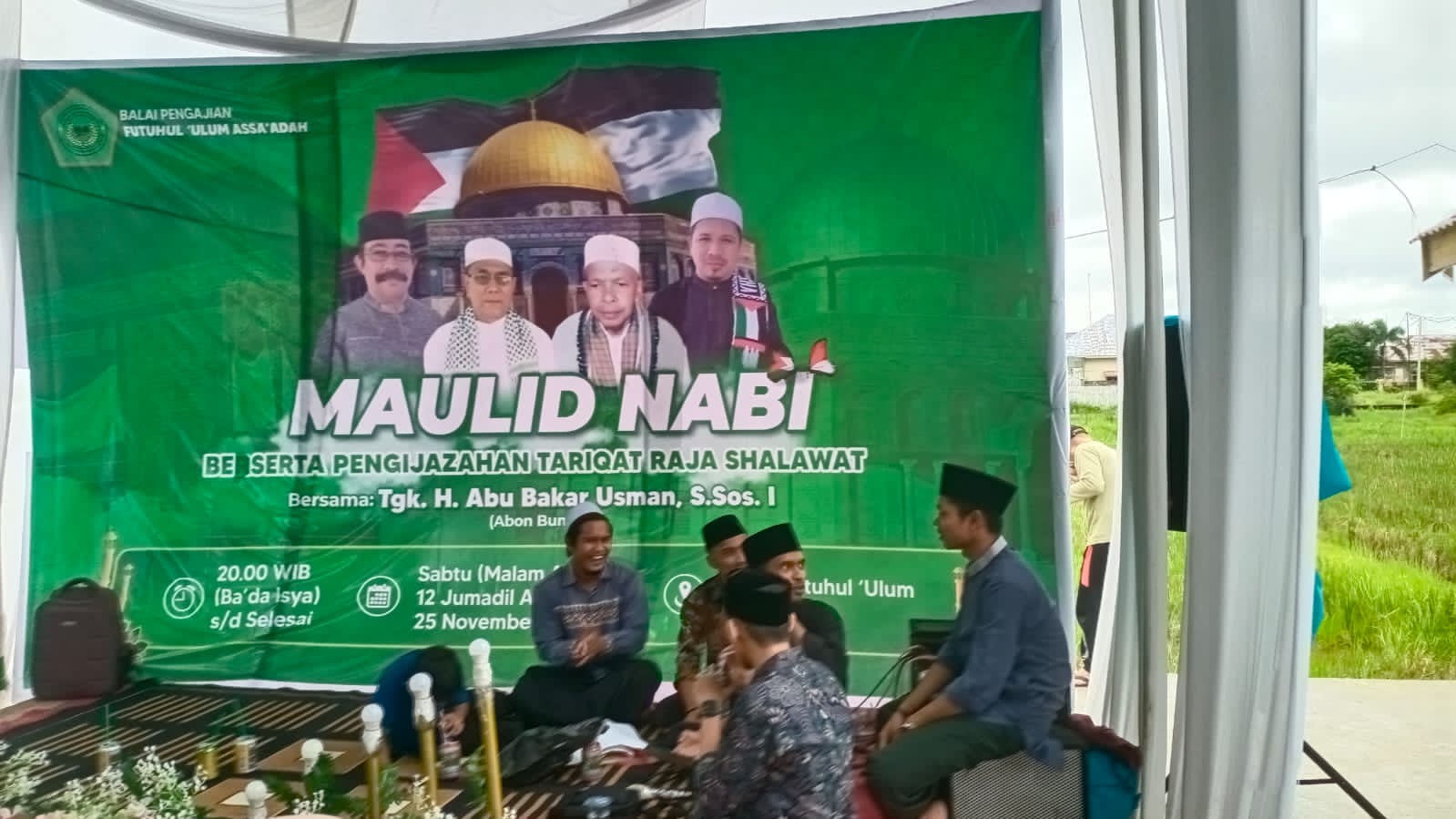 “Peringatan Maulid Nabi ini Tgk Ramli Amri yang akrab disapa Tgk Walidi pimpinan Balai pengajian FUTUHUL ‘ULUM ASSA’ADAH rangkai dengan kegiatan Pengijazahan Tariqat Raja Shalawat bersama Tgk H. Abu Bakar Usman,S.Sos.I.