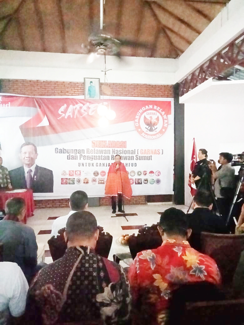 Dalam kata sambutannya Prof Mahfud MD mengucapkan,” ribuan terimakasih kepada seluruh relawan yang sudah tergabung dalam GARNAS serta memberikan semangat kepada seluruh para relawan untuk terus bergerak menang dengan menyampaikan visi misi yang telah ada.