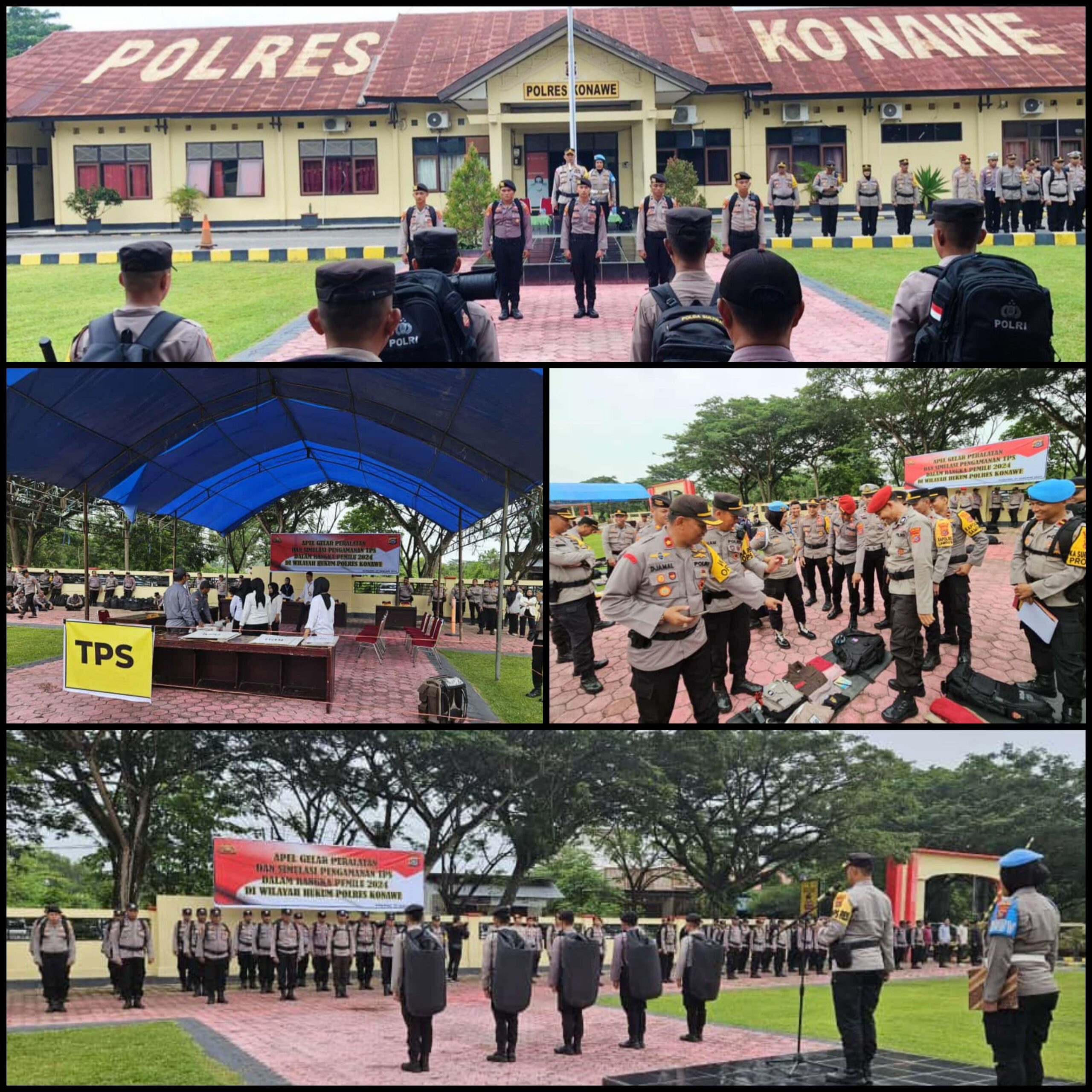 Jelitapos.com – Kabupaten Konawe – Polres Konawe melaksanakan apel sekaligus simulasi pengananan Tempat Pemungutan Suara (TPS) di lapangan Polres Konawe, Kelurahan Inolobunggadue, Kecamatan Unaaha, Kabupaten Konawe, Provinsi Sulawesi Tenggara, Sabtu (27/01/24) Pagi.