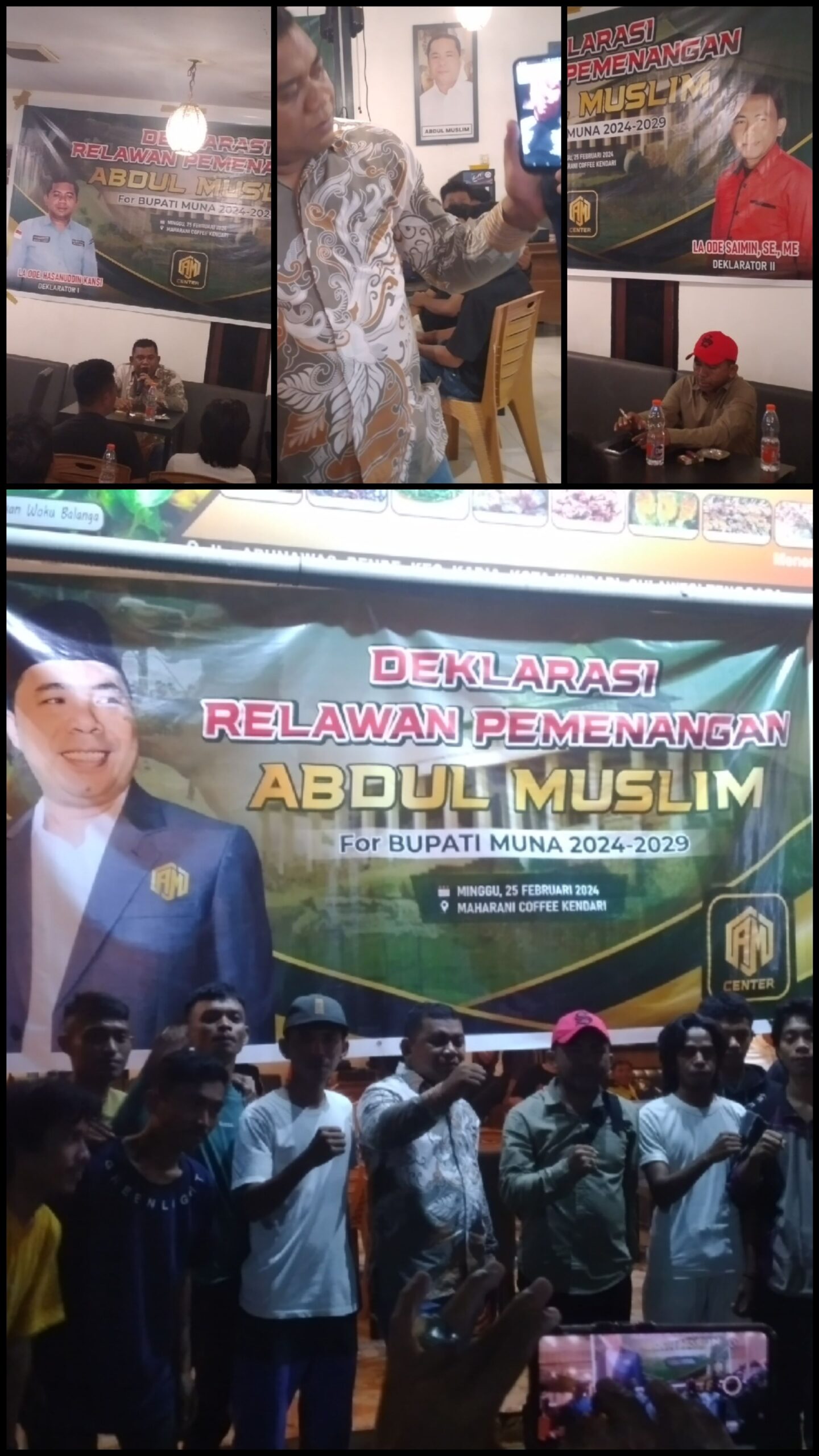 Dalam rangka mendukung langkah Abdul Muslim di Pilkada Muna, relawan pemenangan yang dikomandoi oleh La Ode Hasunuddin Kansi dan La Ode Saimin, oleh nya itu menggelar deklarasi di salah satu warung kopi (Warkop) di Kota Kendari, Provinsi Sulawesi Tenggara, pada Minggu (25/2/2024) malam.