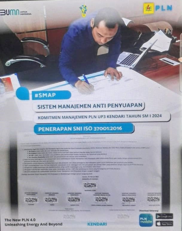 Menurutnya, sebuah penerapan dan prinsip dari Empat (4) NO’s itu, berdasarkan pelaksanaan sistem manajemen anti penyuapan SNI ISO 37001 : 2016 telah kami terapkan di seluruh Unit Pelaksana Pelayanan Pelanggan (UP3) Kendari, Provinsi Sulawesi Tenggara.
