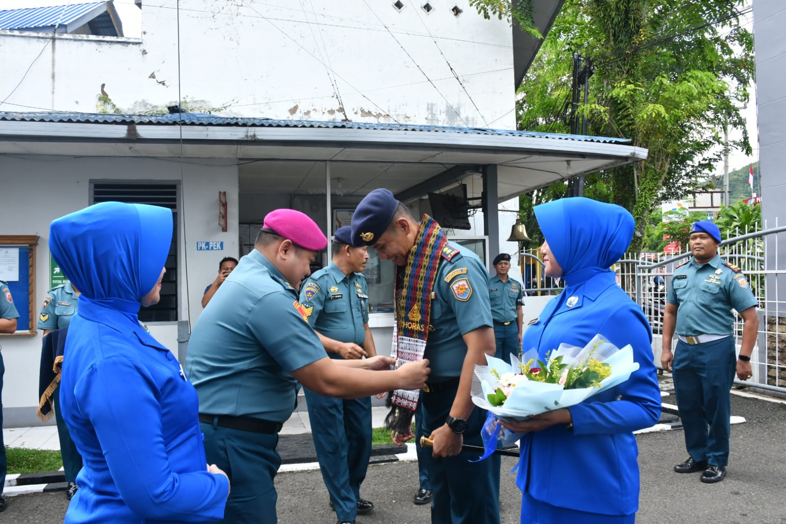 Setibanya Danlanal di Mako Lanal Sibolga langsung disambut oleh Palaksa Lanal Sibolga Mayor Mar Indra Maulana Batubara dan Ibu beserta Keluarga Besar Lanal Sibolga dengan tradisi pengalungan bunga dan Pengulosan yang diiringi menyanyikan lagu selamat datang serta pertunjukan yel-yel prajurit Lanal Sibolga dan dilanjutkan acara Entry Briefing Komandan Lanal Sibolga di Aula Zulkifli Tanjung Mako Lanal Sibolga.