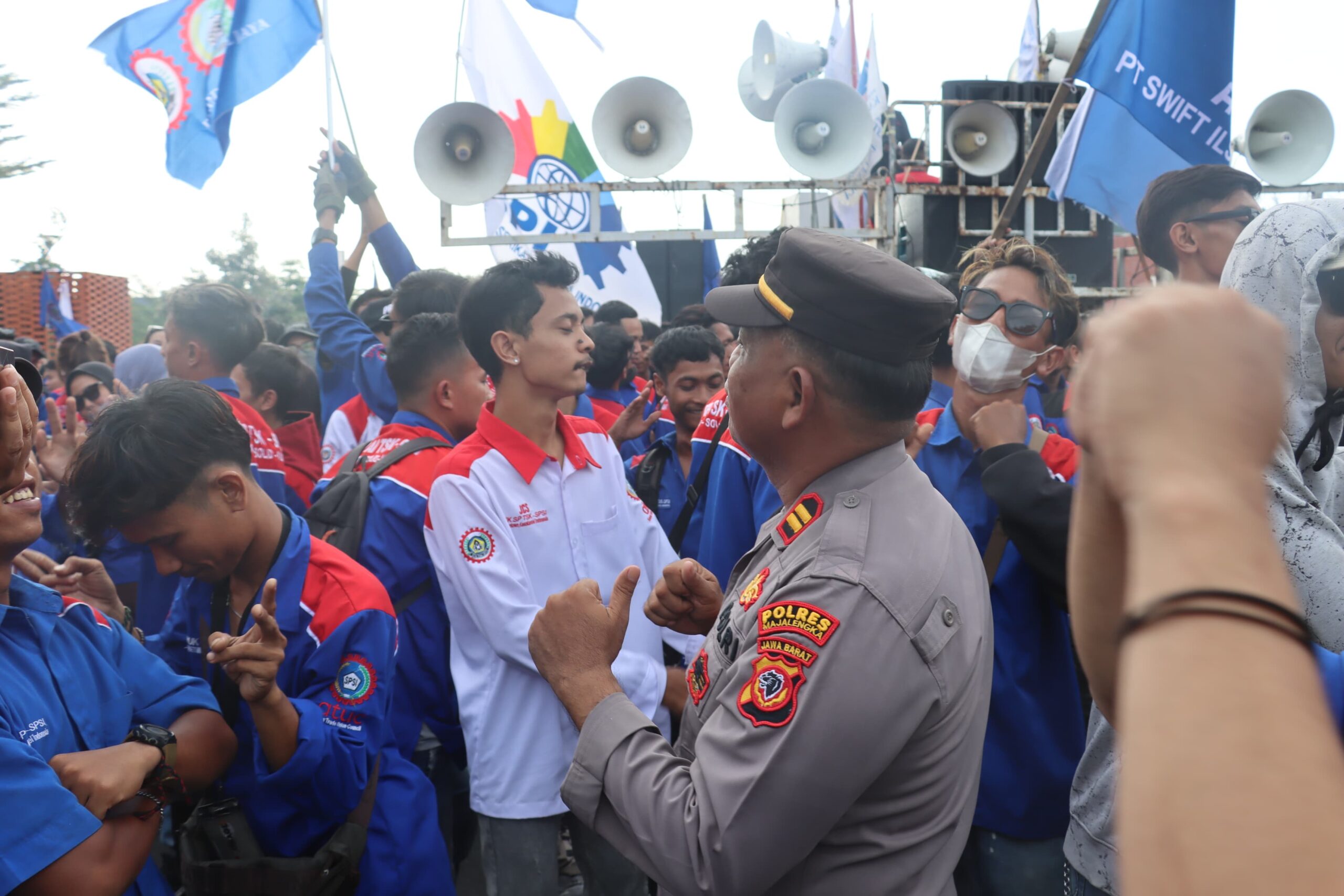 Dalam aksi yang dipimpin oleh para pemimpin serikat buruh, seorang polisi terlihat ikut meramaikan suasana dengan ikut berjoget bersama para buruh. Polisi yang teridentifikasi sebagai Kasat Binmas Polres Majalengka, IPTU Supriyadi, SH, tampak mengikuti irama musik dan langkah joget dengan antusias.