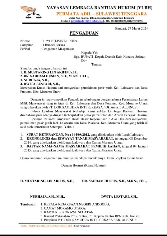 Sebagai Kuasa Hukum Yayasan Lembaga Bantuan Hukum (YLBH) Permata Adil Sultra melalui media ini, H. Mustaring Lin Arifin, S.H.,M.KN.,CEL. angkat bicara bahwa, Cina sudah kembali berulah rampas Hak Warga dan kami pun layangkan surat aduan kepada Bupati Konawe Selatan (Konsel) pada 27 Maret 2024, pekan lalu.