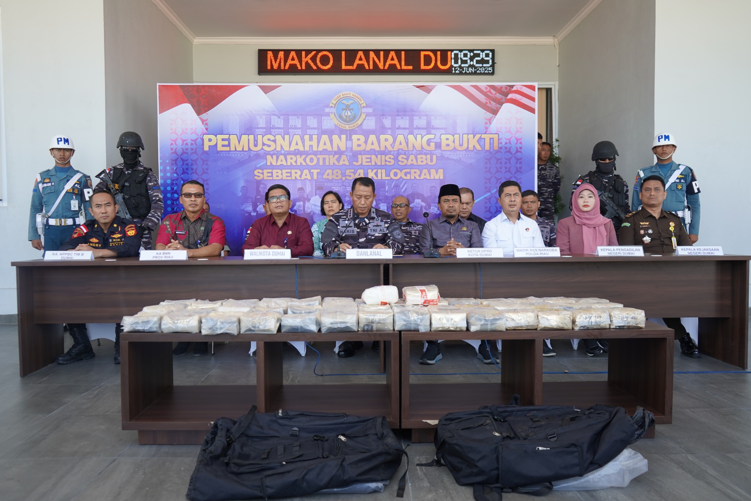 Jelitapos.com Dumai — Dalam upaya nyata memberantas peredaran narkoba di Indonesia, Pangkalan TNI Angkatan Laut (Lanal) Dumai menggelar acara pemusnahan barang bukti narkotika jenis sabu seberat 48,54 Kg di Mako Lanal Dumai, Jalan Yos Soedarso No.01, Kota Dumai. Acara ini dipimpin langsung oleh Komandan Lanal Dumai Kolonel Laut (P) Abdul Haris S.E., M.M.D.S., yang didampingi oleh (PJU) Lanal Dumai, Kamis (12/6/2025).