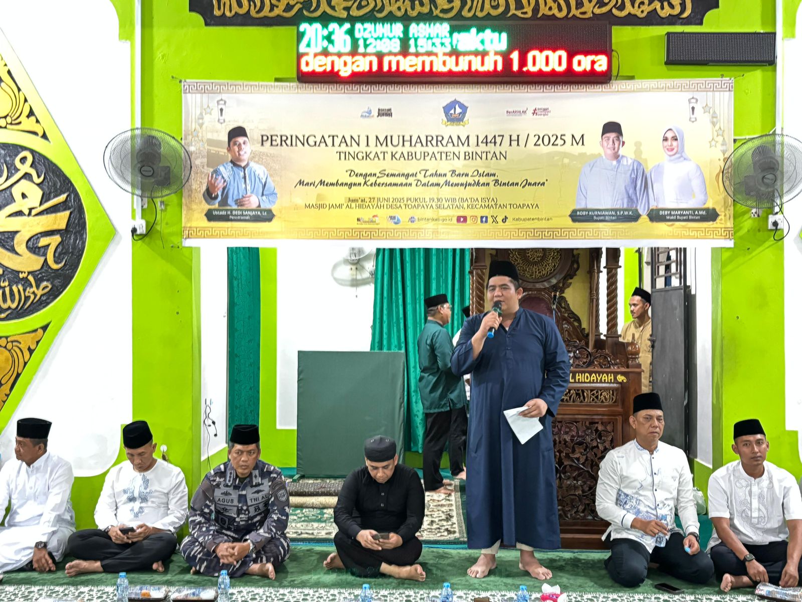 Mengawali sambutannya, Bupati Bintan Roby Kurniawan, S.P.W.K., menyampaikan ucapan Selamat Tahun Baru Islam 1 Muharam 1447 H kepada seluruh masyarakat Bintan. Ia berharap momentum ini dapat kembali menjadi titik awal untuk meningkatkan keimanan dan ketakwaan kepada Sang Khalik.