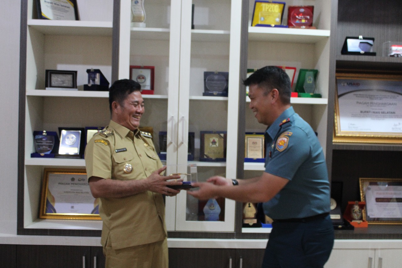 Sebelum mengakhiri kunjungan kerjanya, Danlanal Nias menyerahkan cenderamata Kepada Bupati Nias Selatan.