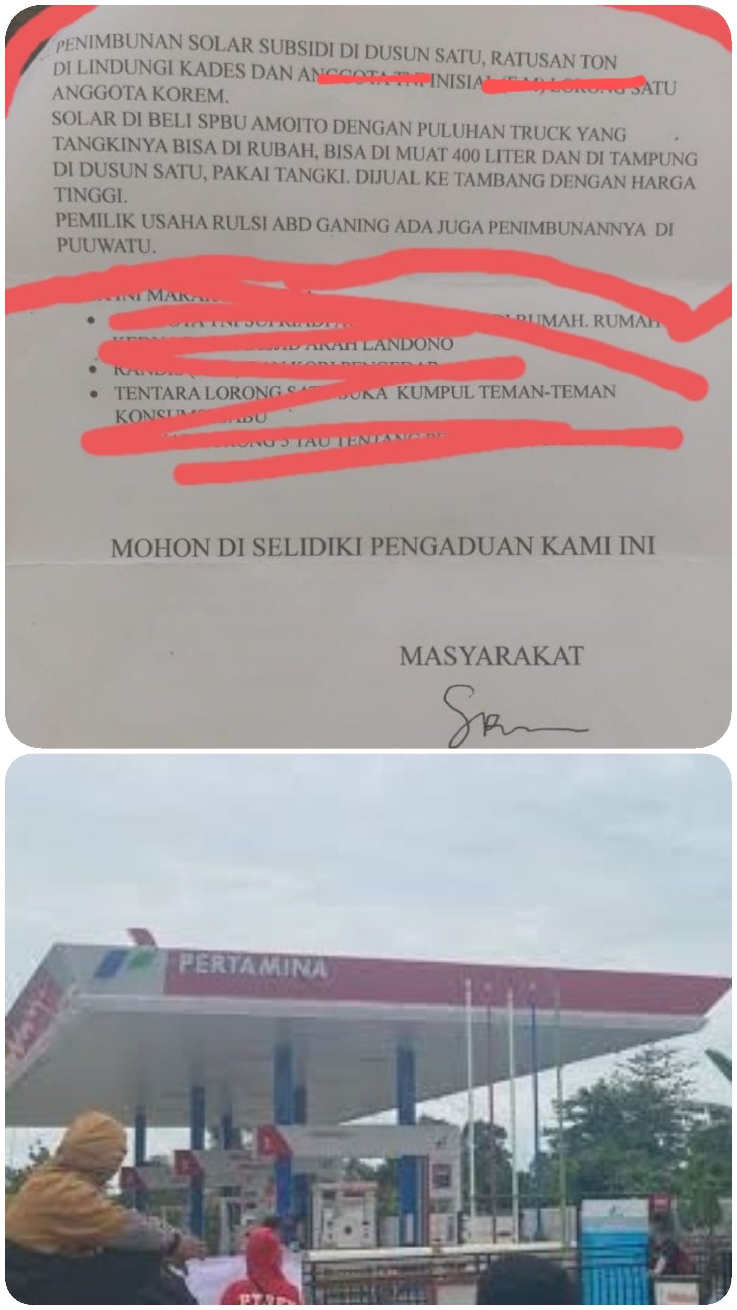 Pengaduan masyarakat bahwa, diduga oknum pemilik SPBU Amoito inisial RL itu menyalahgunakan BBM Subsidi solar dengan harga mahal angkut gunakan Dump Truk juga menampung Solar Subsidi digudang.