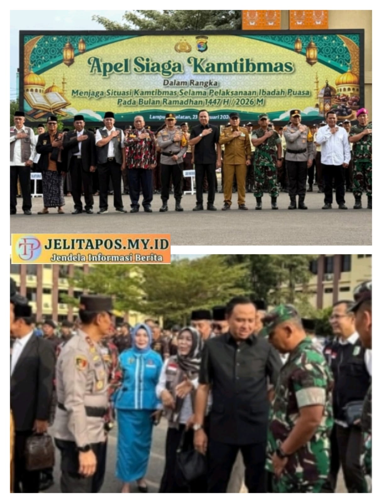 Apel Siaga dipimpin oleh Kapolda Lampung dan diikuti oleh peserta dari berbagai instansi sebagai wujud komitmen bersama dalam memberikan rasa aman dan nyaman kepada masyarakat selama Ramadan 1447 H. ( Tim Humas)