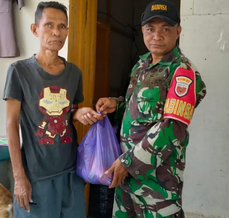 Sertu Laode Anton Babinsa Kelurahan Bende, aktif melaksanakan kegiatan monitoring wilayah hukum dan aktif melaksanakan Jumat Berkah berupa pembagian sembako kepada warga yang membutuhkan atau tidak mampu.
