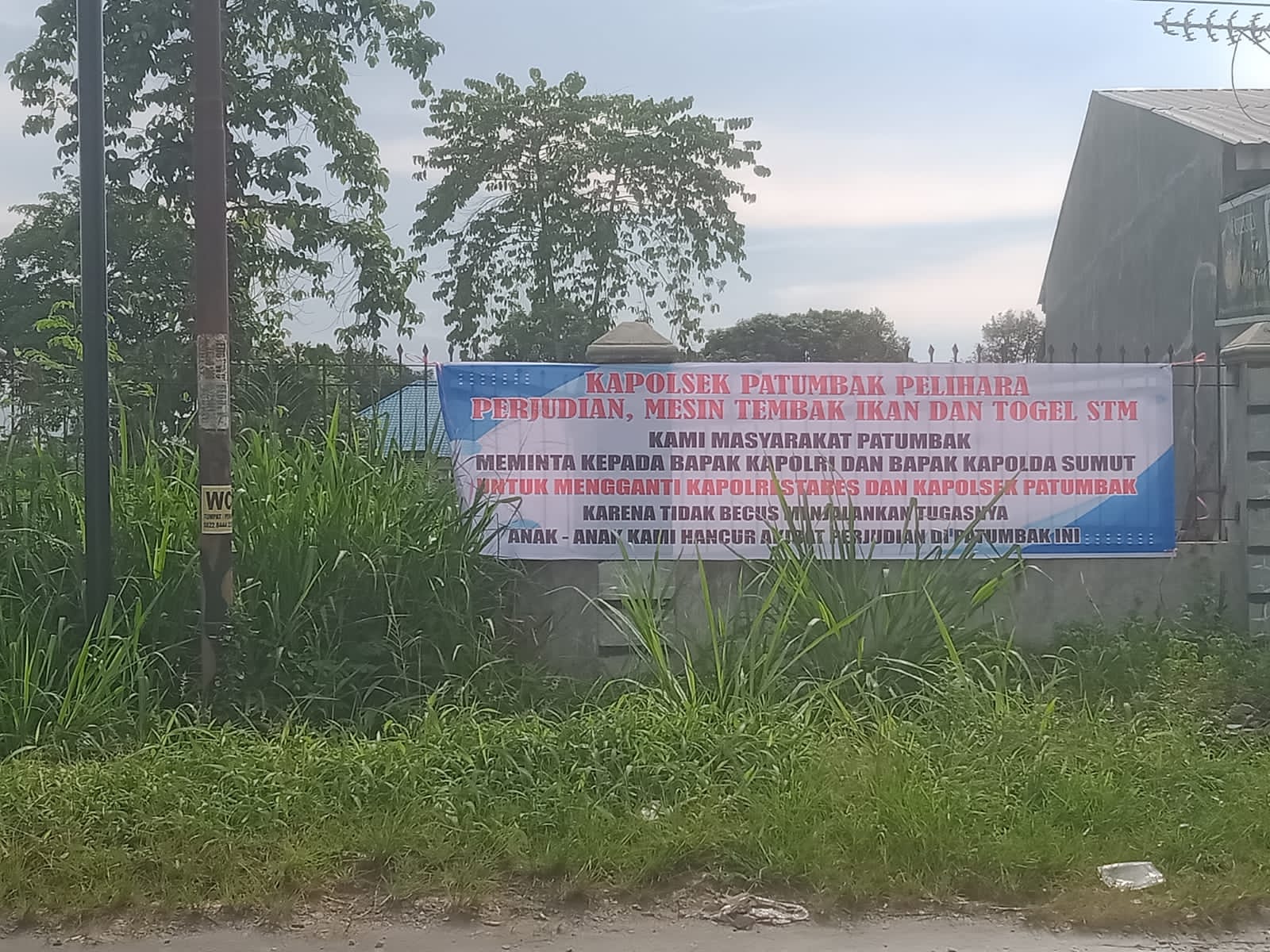 JelitaPos.My.Id- Patumbak,- Terpampang jelas Spanduk bertulisakan meminta Kapolsek Patumbak utuk dicopot dari jabatannya karena diduga kuat pelihara perjudian diwilayah hukum patumbak,Sudah jelas padahal Saat umat Muslim tengah menjalankan ibadah puasa di Bulan Suci Ramadhan 1447 H/2026, praktik perjudian ketangkasan jenis tembak ikan ikan dikabarkan melenggang bebas tanpa tersentuh hukum di wilayah Polsek Patumbak.