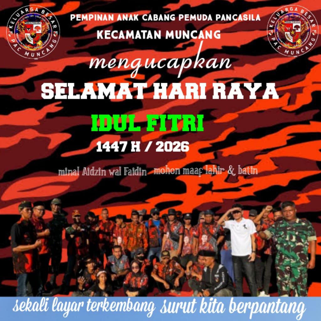 Jelitapos.My.Id- Menjelang tibanya hari kemenangan, keluarga besar pimpinan anak cabang (PAC) pemuda Pancasila Muncang, secara Resmi menyampaikan ucapan selamat hari raya idul Fitri 1 Syawal 1447 H kepada seluruh masyarakat muslim Di kecamatan Muncang dan sekitarnya.