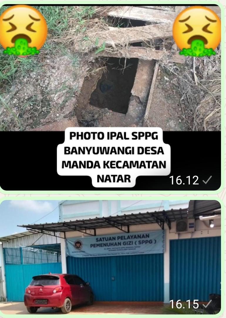 Sanitasi (SLHS). Tanpa sistem Pengolahan Limbah yang memadai, lain halnya yang terjadi di SPPG Dusun Banyuwangi Desa Manda Kecamatan Natar Kabupaten Lampung Selatan,diduga kuat akibat pengolahan limbah yang tidak memadai sehingga menimbul bau busuk yang sangat menyengat, Pada Senin 27 April 2026.